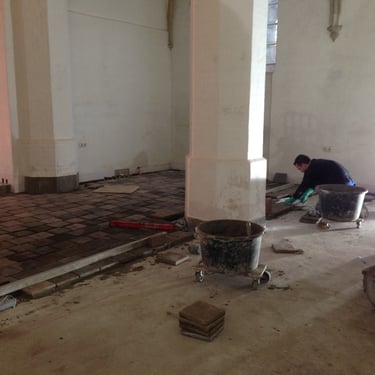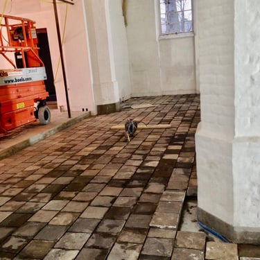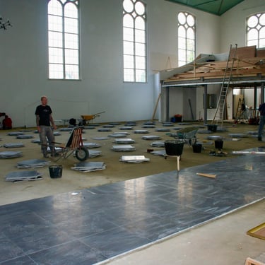 In Europe, many churches are being repurposed due to a decrease in attendance, allowing them to serve new functions while preserving these historic buildings for the future. Some churches are being converted into apartments, others into community centers, and some into office spaces after renovation. This transition often requires significant technical modifications, such as the installation of heating systems, as most churches did not have any before. Given their height, conventional heating methods can be inadequate, complicating their new uses. We collaborated with builders and architects to tackle these issues, especially considering that the floors sometimes spanned nearly 800 to 1000m2. Frequently, original materials (like tiles), some as old as 750 years, were incorporated, necessitating mortar mixtures that closely matched the original compositions used in the past.